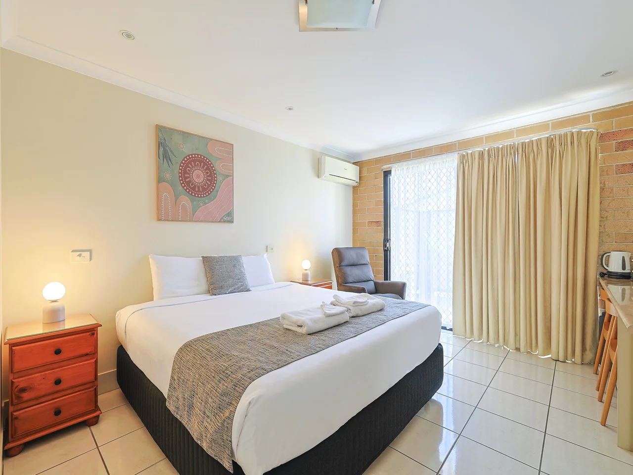 Our Deluxe Queen Room offers the perfect blend of comfort and style, featuring a plush queen bed. The room is equipped with a smart TV, complimentary WiFi, tea and coffee making facilities, a private courtyard, and free undercover parking for your convenience